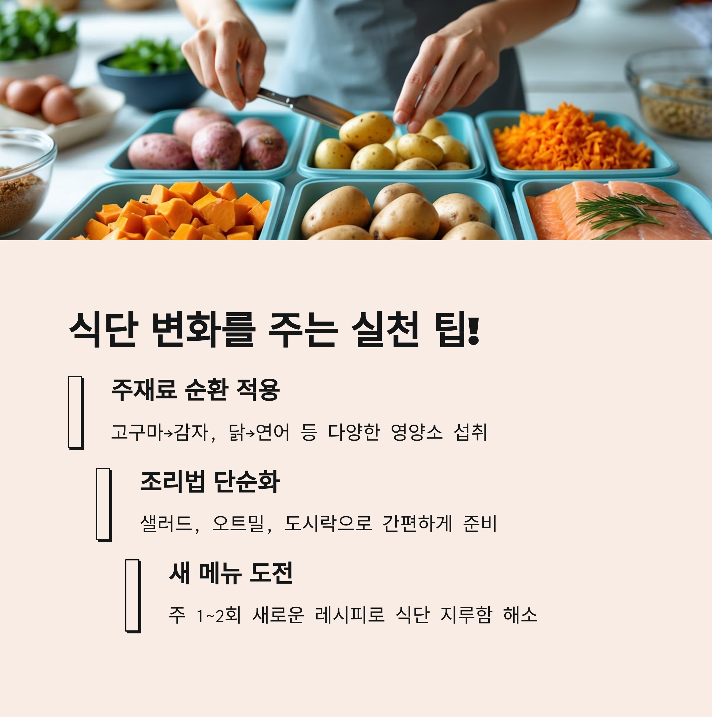 | 탄수화물, 단백질, 지방 적절 분배 | 주재료만 바꿔 식단 유지 | 간편하고 지속 가능한 구성 |