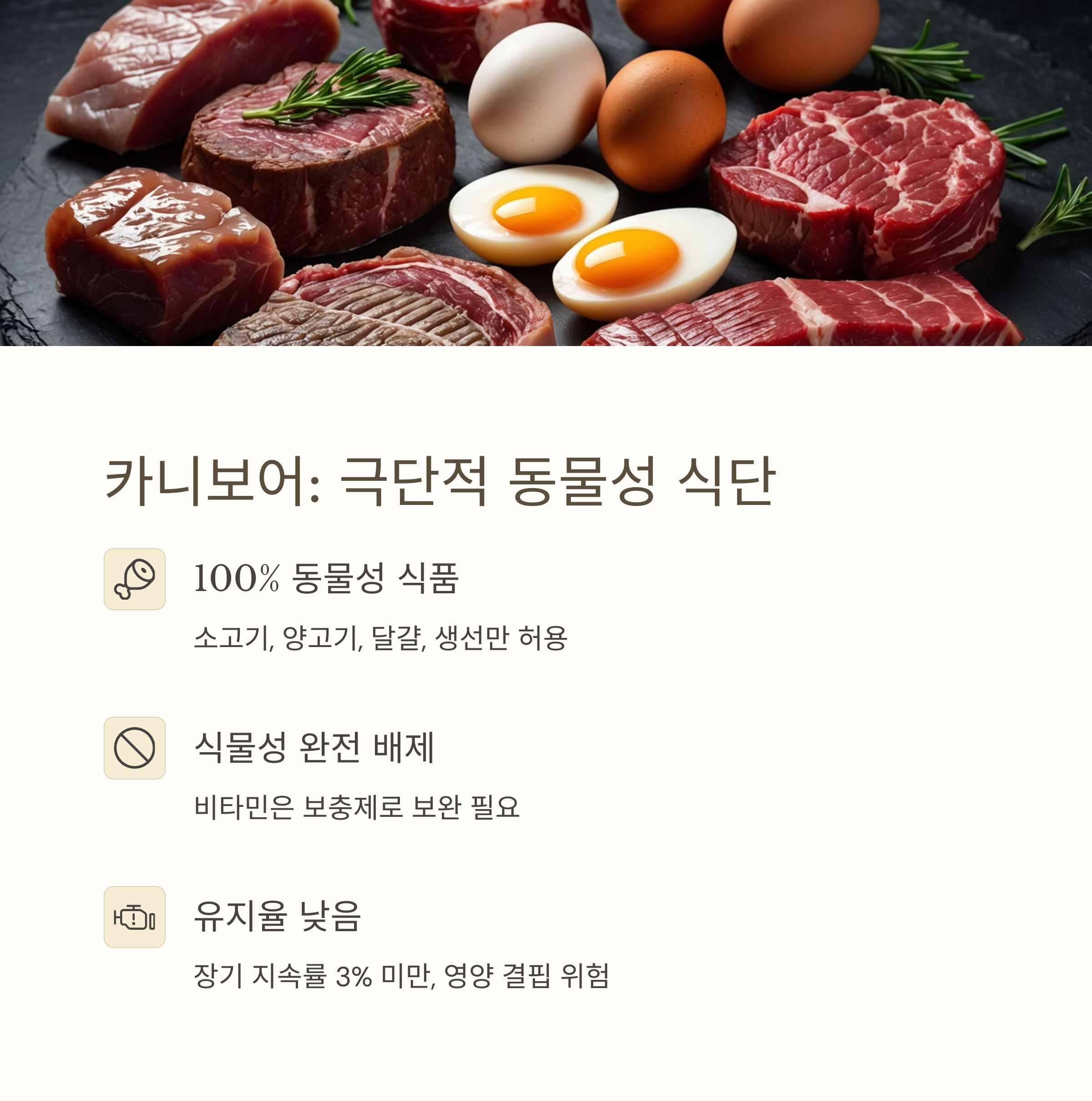 카니보어 식단은 100% 동물성 식품만을 섭취하는 방식으로, 대표적으로 소고기, 돼지고기, 계란, 생선 등이 있습니다. 탄수화물과 식물성 식품은 완전히 배제되며, 알레르기나 장 질환, 자가면역 문제를 개선하는 데 도움을 주는 경우도 있습니다. 그러나 식단의 단조로움섬유소 부족으로 인한 변비, 사회적 제약이 발생할 수 있어 장기적으로 실천하기 위해서는 뚜렷한 목적의식과 건강 상태 점검이 필요합니다.